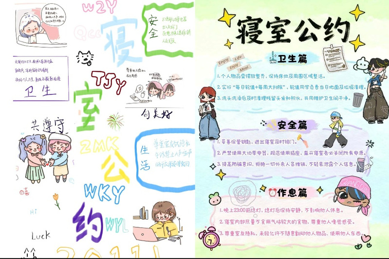 一纸公约,共筑文明之基:各宿舍围绕作息制度、值日安排、学习氛围等展开充分讨论,以手绘海报、电子设计、平板绘画等形式,创作出兼具创意与可行性的“宿舍公式”。这些公约不仅设计新颖、内容务实,更体现出同学们自我管理、共建文明的自觉意识,为和谐宿舍建设奠定了制度基础。