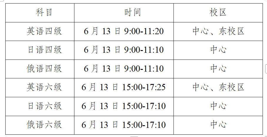 (二)全国大学英语四、六级考试笔试(以下简称笔试)考试时间为6月13日,开考科目为英语、日语、俄语的四级、六级,时间及校区安排见下表: