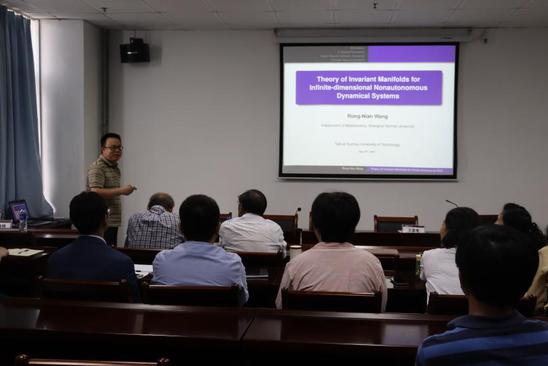王荣年教授的报告题目为“Theory of Invariant Manifolds for Infinite-dimensional Non- autonomous Dynamical Systems”。他指出,不变流形理论对研究无穷维系统的局部或全局动力学具有重要的作用,而非自治系统的不变流行研究难度更大。王教授首先介绍了报告内容的研究框架,分析了研究所用到的概念和工具,最后给出了主要研究结果。