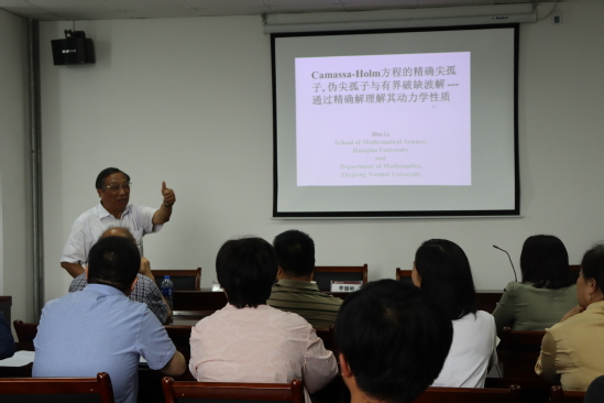 李继彬教授做了题为Camassa-Holm方程的精确尖孤子伪尖孤子与有界破缺波解--  通过精确解理解其动力学性质的报告。李教授介绍了研究尖孤子伪尖孤子的一般性方法。他指出,国外很多学者研究此类问题时研究方法的错误导致了研究结论的错误,并由此勉励大家批判性的阅读国外文献。