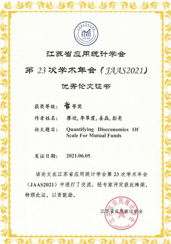 江苏省应用统计学会第23次学术年会(JAAS2021)由江苏省应用统计学会主办,于6月4-6日在淮阴工学院隆重召开。本次年会以“大数据时代的统计学及其应用”为主题,来自省内外34个单位的128名专家和学者参加了会议。我院教师李翠霞博士在本次会议上作了题为“Quantifying Diseconomies of Scale for Mutual Funds”的学术报告,得到了与会专家和学者的一致好评,并获得江苏省应用统计学会第23次学术年会(JAAS2021)优秀论文一等奖。