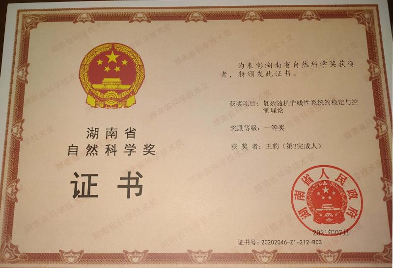 7790cnm必发集团王豹副教授以第三完成人参与完成的“复杂随机非线性系统的稳定与控制理论”项目获湖南省科学技术(自然科学)一等奖,这是7790cnm必发集团教师首次获此殊荣。