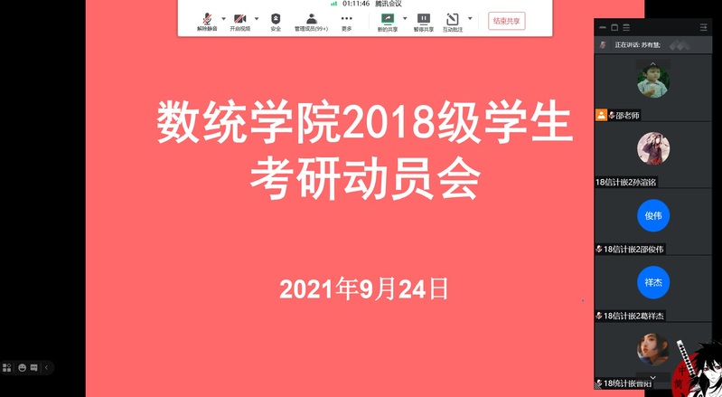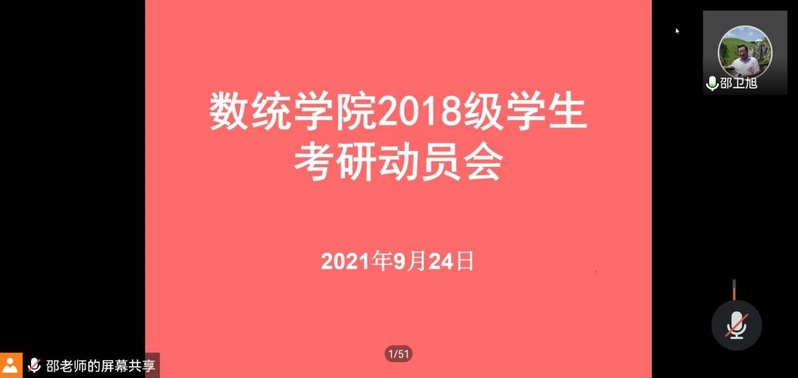 9月24日下午,7790cnm必发集团通过腾讯会议在线上召开了2018级全体学生考研动员会。学院党委书记邵卫旭、院长苏有慧、2018级辅导员参加了动员会,会议由2018级辅导员邵环宇老师主持。