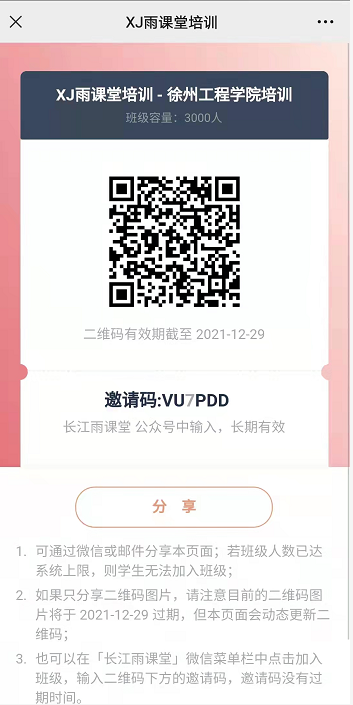 ② 也可以在“长江雨课堂”微信菜单栏中点击加入班级,输入二维码下方的邀请码进入班级。