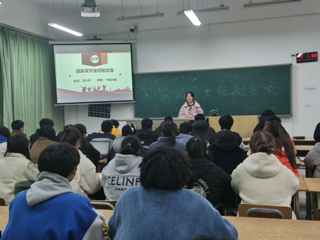 交流会上,两位同学分别从基础专业课学习、学科竞赛、科研项目、阅读、时间管理、社会实践活动等角度,分享了自己大学的成长经历。国家奖学金获得者踪小轩分享了自己的学习方法和学科竞赛经验,强调了基础课程学习的重要性,介绍了学科竞赛的过程,分享了加入学科竞赛协会进行专业学习的经历,并鼓励大家要积极参加英语、高数、数学建模、市场调查与分析等学科竞赛,通过竞赛积累经验,检验自己所学。国家励志奖学金获得者乔欣如从词汇量的积累,听与说和阅读三个方面给出了学习英语的建议,希望接受资助的同学们要认真对待每一堂课,坚持学习英语,要培养抗压能力,学会发掘实现目标的多种途径。两位同学向在座的学弟学妹们表达衷心的祝愿,希望学弟学妹们在接下来的大学英语四级考试中能够取得理想的成绩。