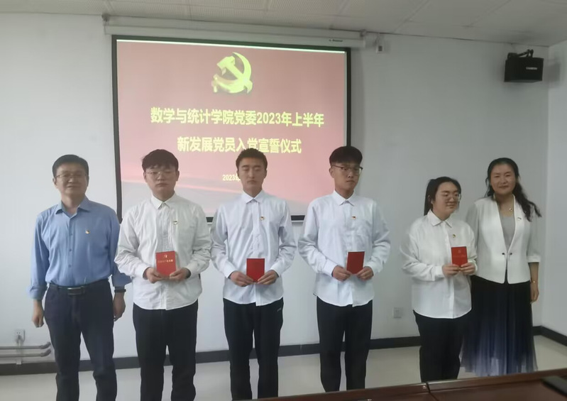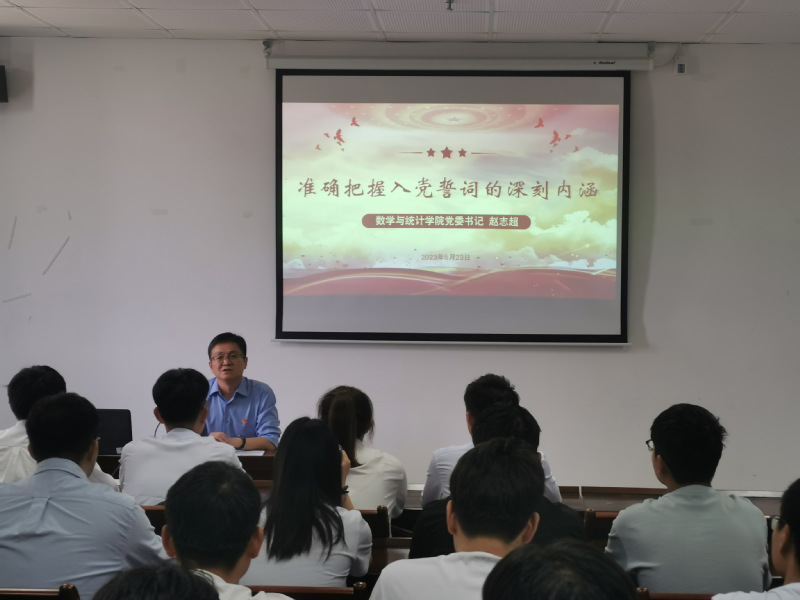 为深入学习贯彻党的二十大精神,落实新时代党的建设总要求,促进新接收预备党员坚定理想信念、加强党性修养,牢记党员身份、发挥先锋作用,按照发展党员工作程序和相关规定,数学与统计学院5月23日上午,在敬业楼1501举行了新接收预备党员入党宣誓仪式。仪式由学生党支部书记茌攀主持,学院全体学生党员、入党积极分子和新接收的预备党员参加了本次活动,学院党委书记赵志超、副书记吕楠参加了宣誓仪式。