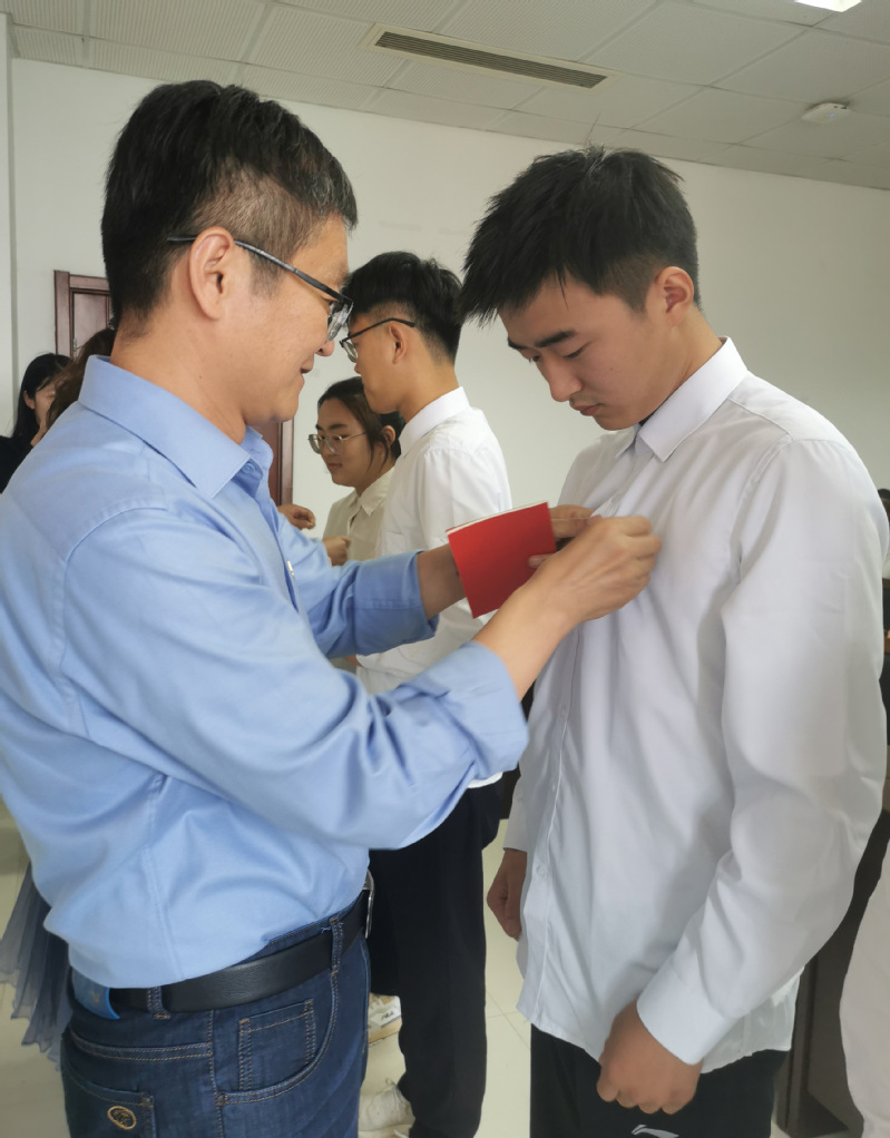 大会在庄严的国歌声中拉开序幕。学生第党支部书记茌攀代表学生党支部委员会向新接收的预备党员表达了衷心的祝贺和热切的期望,学院党委书记赵志超、副书记吕楠为新接收的预备党员佩戴党徽、赠送《中国共产党章程》。新接收的预备党员面向鲜红的党旗庄严宣誓,老党员重温入党誓词,他们举起右手,在辅导员季如老师的领誓下,庄严宣誓,宣誓过程庄严凝重,深切表达了新接收的预备党员对党的无限忠诚和为党的事业奋斗终身的坚定信心和决心。