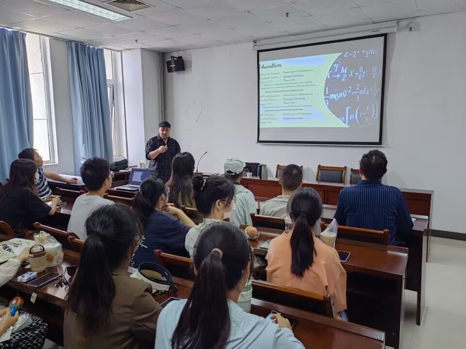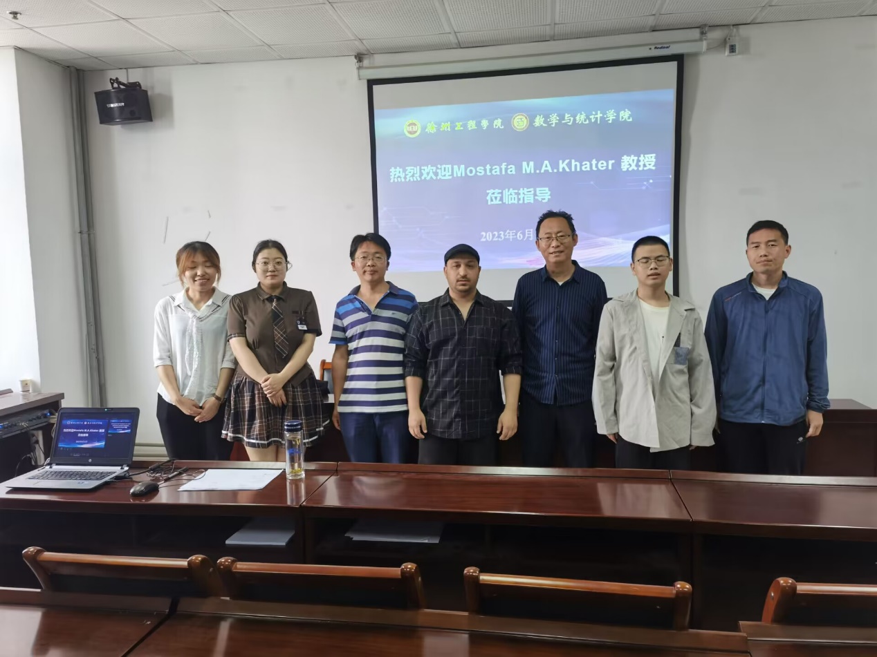 Mostafa M. A. Khater教授首先从非线性偏微分方程入手对相关数值模型解法进行了讲解,对于怎样提出一种新的数值方法给出了独到的见解,并结合Kater方法以及修正的Kater方法加以说明。紧接着,Kater教授讲解了怎样将非线性分数阶Duffing方程转化为常微分方程的研究过程以及修正的Benjamin Bona Mahony模型的数值解法。最后,Kater教授与我院教师进行了深入的学术交流,解答了部分教师的提出的问题。